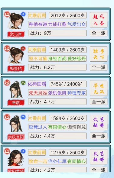 3. 弟子天赋——近百种天赋随机搭配组合,而后弟子们依据天赋被分派至各个分支,在各自岗位上各尽其责。