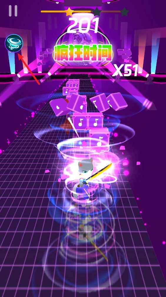 3、游戏正式开启后,玩家仅需通过左右滑动屏幕,就能操控猫咪的移动方向,精准命中沿途出现的音符与敌人。命中越是精准,得分也就越高!