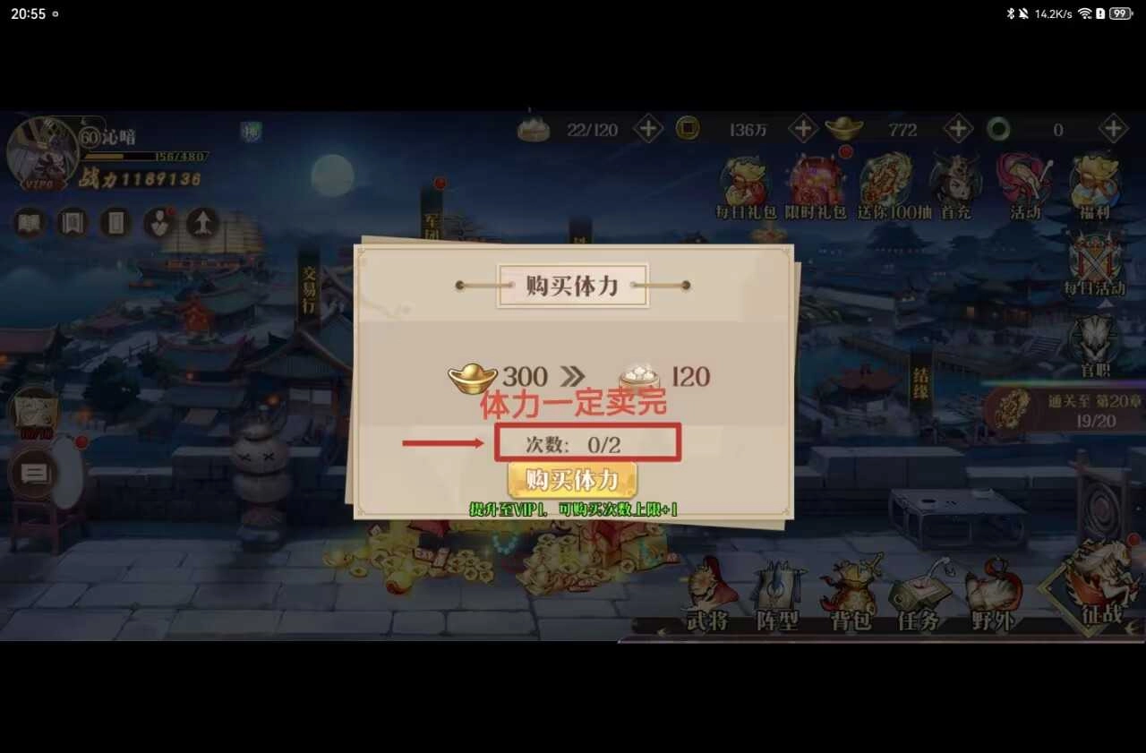 每日务必将体力购买次数拉满,具体可购买次数会依据VIP等级相应增加。