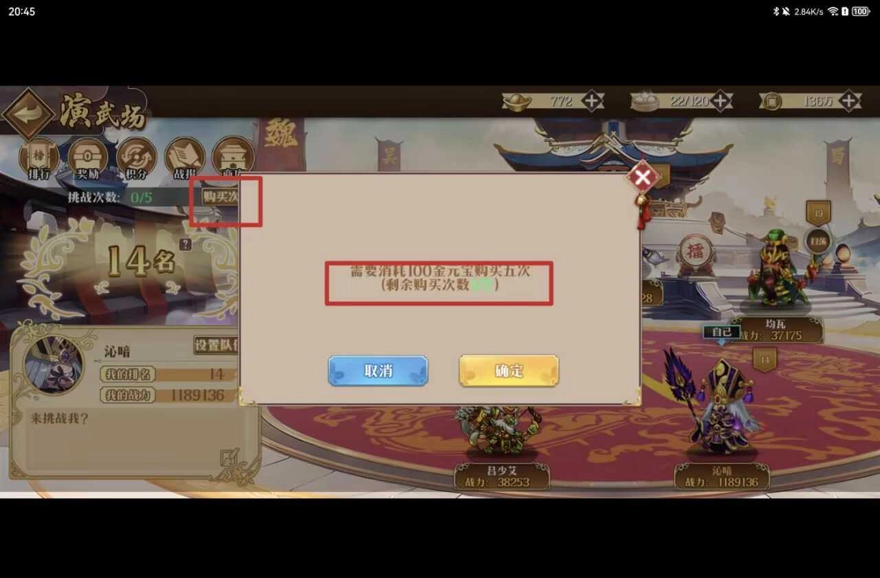 每天在演武场购买一次,确保把竞技积分任务的奖励全部拿到。