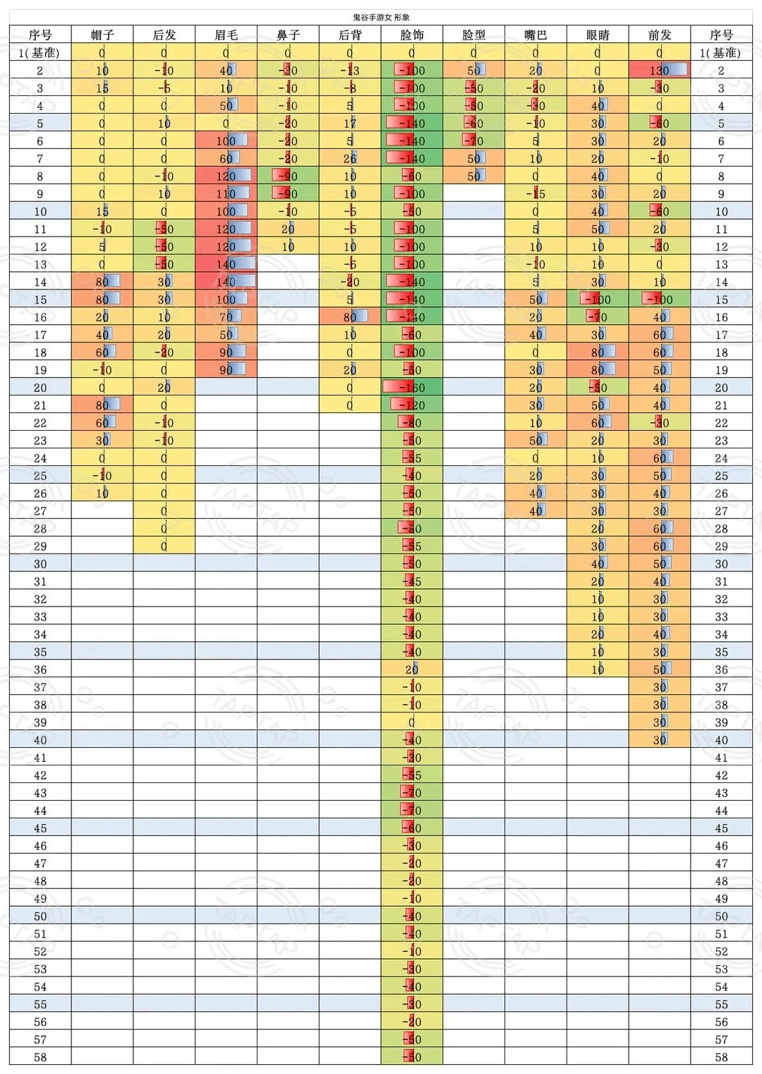 以下为女性捏脸魅力值的详细列表: