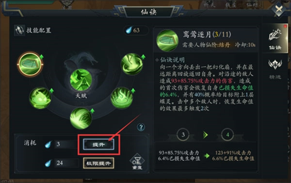 每次强化技能的精进分支后,需点击相应的精进方向来完成实装。针对单个技能的单个分支,其单个效果能够提升三级,即可以经历三个提升阶段(悟——真——仙) 。
