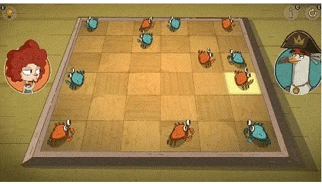 ●玩家每次能够操控一只螃蟹进行横向或者纵向的移动,螃蟹移动的格数没有限制,当碰到其他螃蟹或者边界的时候就会停止。