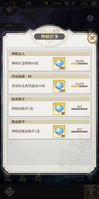 种植任务共有四类,皆为阶段性任务,可重复执行,奖励以钻石为主。这四类任务分别为:需达到一定种植次数的“种植达人”;要求进行互动浇水的“拜访协助”;规定要种植出仙草的“收获仙草”;还有“极品仙草”任务。
