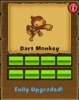 (提升射程)→(提升射程并且能够击中迷彩气球)→(射击速度降低,然而能够攻击18个气球)→(增强对陶瓷气球的攻击力,还能攻击铁质气球)