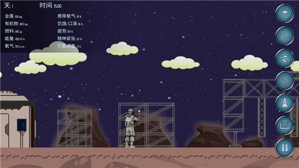 2、这时开始学习(右边从下往上数第二个按钮),嗯,友情提示植物学才是王道,当然一开始也要优先学习植物学,因为每次从房间出去都会消耗一部分的氧气,在建造太阳能板和机器人模块时会消耗不少。 而水槽一开始生成的氧气实在少了点,所以我们要抓紧时间学习提高自身知识水平来种菜。 随着机器人制造的归来,金属和有机物也会被带回来,这时升级水槽,直到可以一直保持稳定就行了,宇航员耗氧速度为一小时0.18。 俗话说饱暖思淫欲,现在我们已经没有生存的困扰了,于是我们就要考虑探索星球了。 探索星球的方式是使用那个黑蓝色的无人机,派出去它自己就能处理好一切,真是乖孩子。