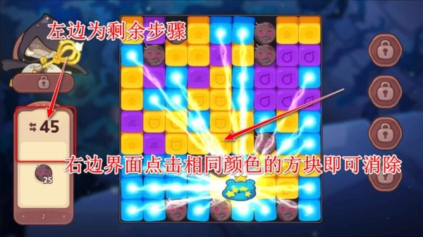 1. 消除闯关的关卡模式与一般消除玩法类似。关卡界面左边显示剩余步骤,在右边界面点击相同颜色的方块就能实现消除,满足关卡要求便可通关。