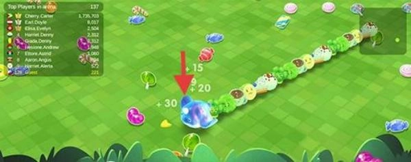 1. 开局发展:控制蛇形形象(具有彩色外观且带有数字标识),在地图中拾取彩色道具(如 +30、+15 这类),以此增加长度并获取积分。