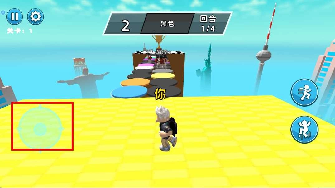 1. 踏入游戏关卡,通过操控左侧的虚拟摇杆,就可以掌控角色在平台上进行移动,为踏上由颜色圆盘构成的路径、开启闯关做好准备。