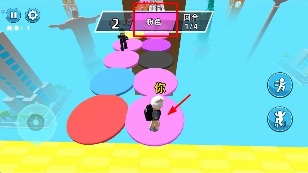 2、依照上方提示的颜色,例如粉色,操控角色移动至相应颜色的圆盘,顺着颜色指引前行,完成每一轮的颜色匹配。