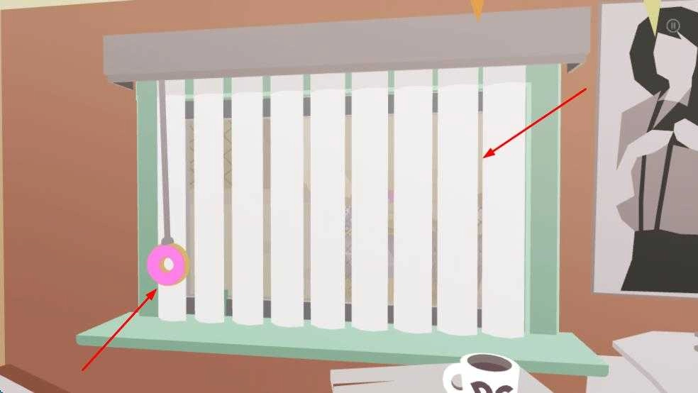 3、在室内场景中,寻觅粉色甜甜圈这一互动元素,对其进行操作,从而触发与百叶窗等场景的互动,进而解锁新内容。