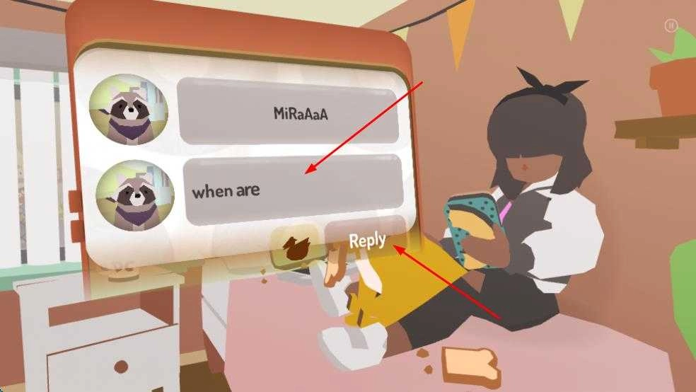 2. 进入对话场景,留意MiRaAaA发送的“when are”消息,点击“Reply”进行回复,以此推动剧情交流。