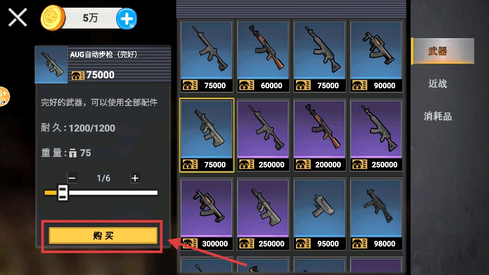 1. 在武器购买页面,选中【AUG自动步枪-(完好)】,仔细确认其属性之后,点击购买选项,以此提升自身战力,从容应对校园挑战。