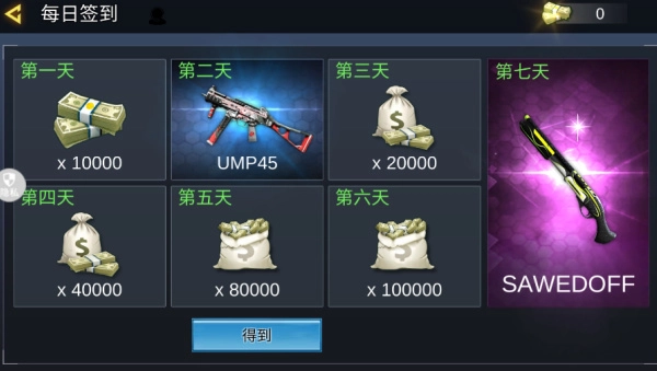 1、每次登录游戏后,主动点击参与签到活动,获取免费福利,积累更多游戏金币与武器。连续签到7天,还能逐步领取到更高级别的枪械。