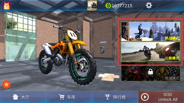 1. 来到游戏主界面,在右侧挑选【挑战模式】或者【公路模式】,就此开启山地摩托的越野之行。