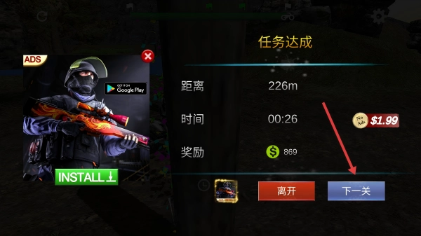 4、完成当前关卡后,点击【下一关】,迎接更具挑战性的复杂赛道,通过积累奖励来提升摩托性能。