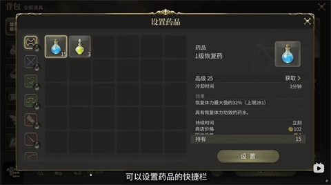 背包容量可通过特定道具进行扩展,物品支持直接售卖与回收操作,药品快捷栏能自定义配置各类药品类道具。