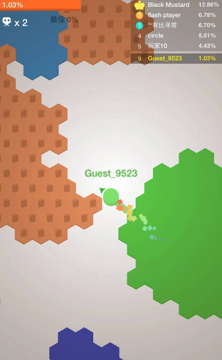 这款休闲竞技游戏以圈地为核心玩法,看似操作简单,实则需要精准的策略规划与快速反应。玩家在扩张领地的同时,必须时刻提防对手的突袭,任何一丝松懈都可能导致前期积累付诸东流,每一秒都需保持高度专注。游戏画面简洁明快,没有多余的装饰元素,让玩家能全身心投入到领地争夺的紧张对抗中。虽然上手容易,但要在对局中胜出绝非易事——如何规划最优圈地路线、判断攻防时机,都考验着玩家的临场决策能力。更有趣的是随机出现的道具系统,瞬移、加速等技能的巧妙运用,常常能在局势胶着时打破平衡,实现逆风翻盘,让每一局对战都充满意想不到的变数与惊喜。
