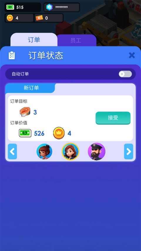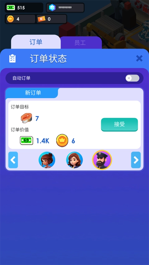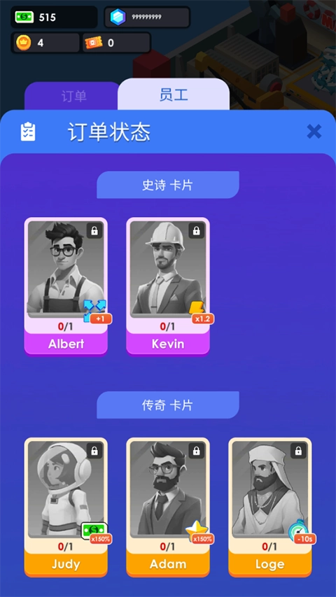 玩家可以通过金币来解锁不同等级的员工;