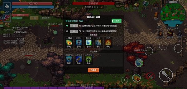 找到界面右上角的自动战斗选项,把自动回血、自动放技能这些功能都配置妥当后,点一下底部的启用按钮,就能让角色自动打怪了。