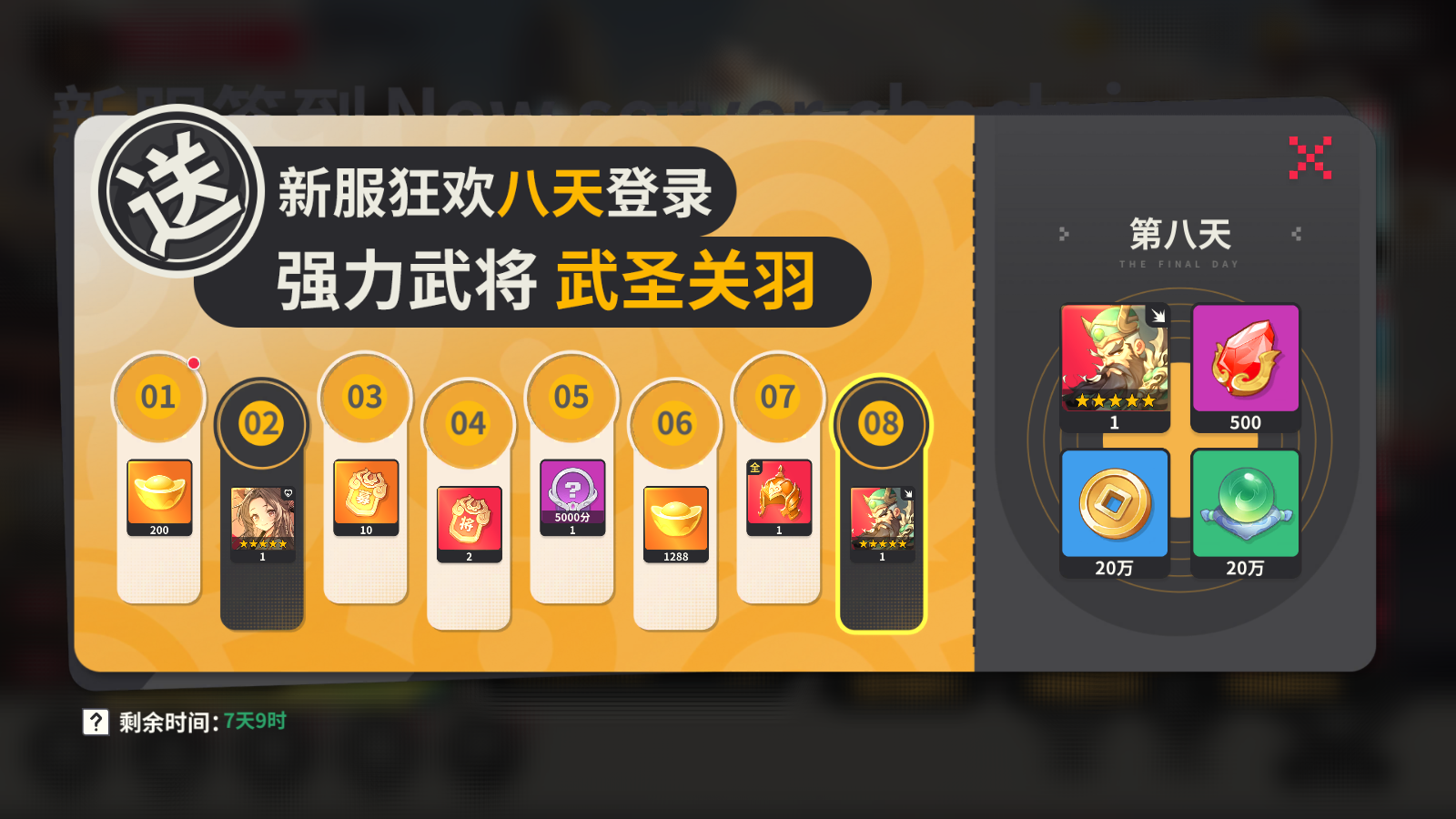 每天签到可领取材料,第二天送辅助小乔、第三天送十连抽、第七天送随机随机五星武将,第八天送武圣关羽,洛阳唾手可得。