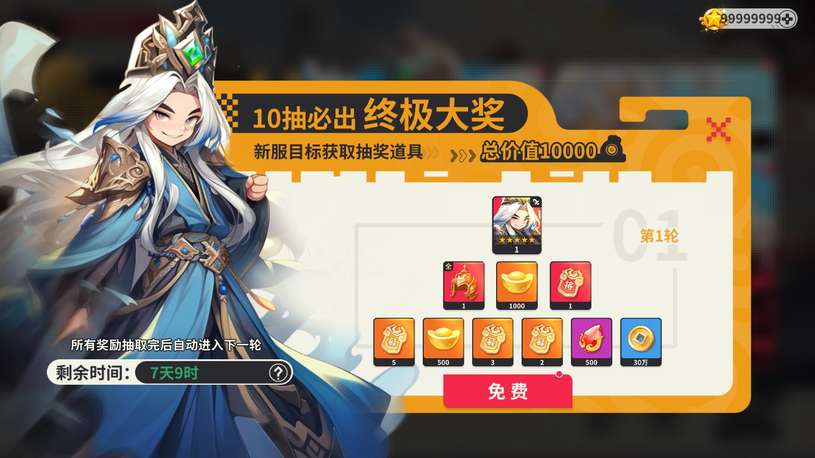 角色达到指定等级,皆可试抽三次十连抽,并且免费领取其中一组,普通天意拟定也可消耗元宝全部领取,强力阵容轻松组建。
