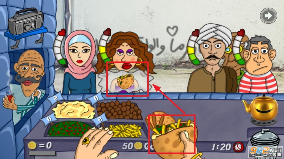 这是一款阿拉伯餐厅主题的游戏,里面包含了鹰嘴豆、沙拉三明治、沙拉、薯条、披萨汉堡等多种菜品的制作模拟内容。