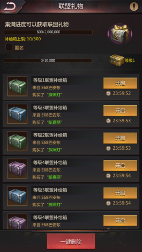加入联盟后,若有盟友购买礼包,全盟成员均可领取对应的赠送礼包,务必记得及时领取;当进度集满时,还能额外获得联盟礼物。