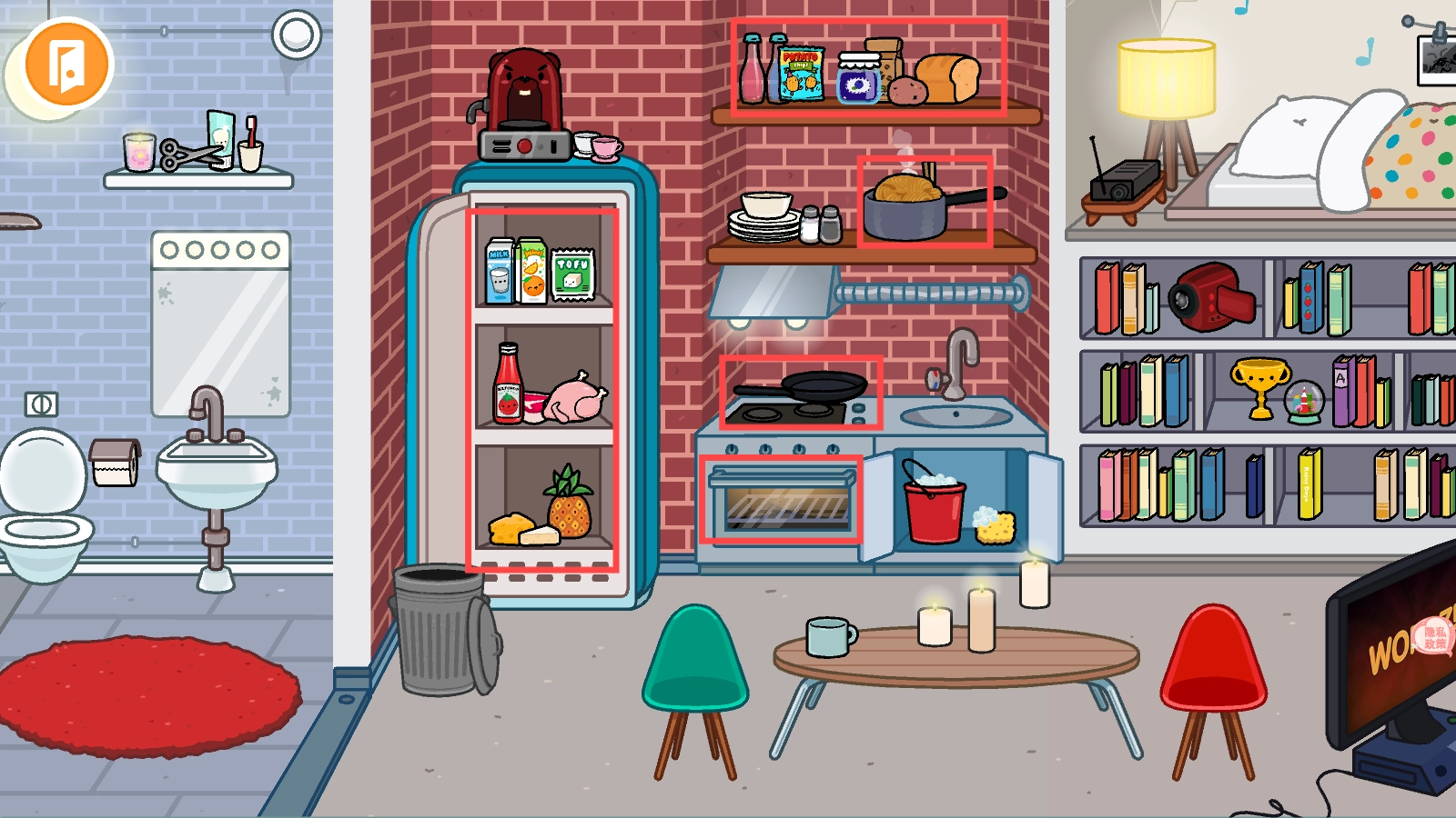 在厨房这片区域,我们可以打开冰箱拿取食材,取用橱柜里的物品,也能操作炉灶、烤箱之类的设备,来试着烹饪出美味的餐食吧。
