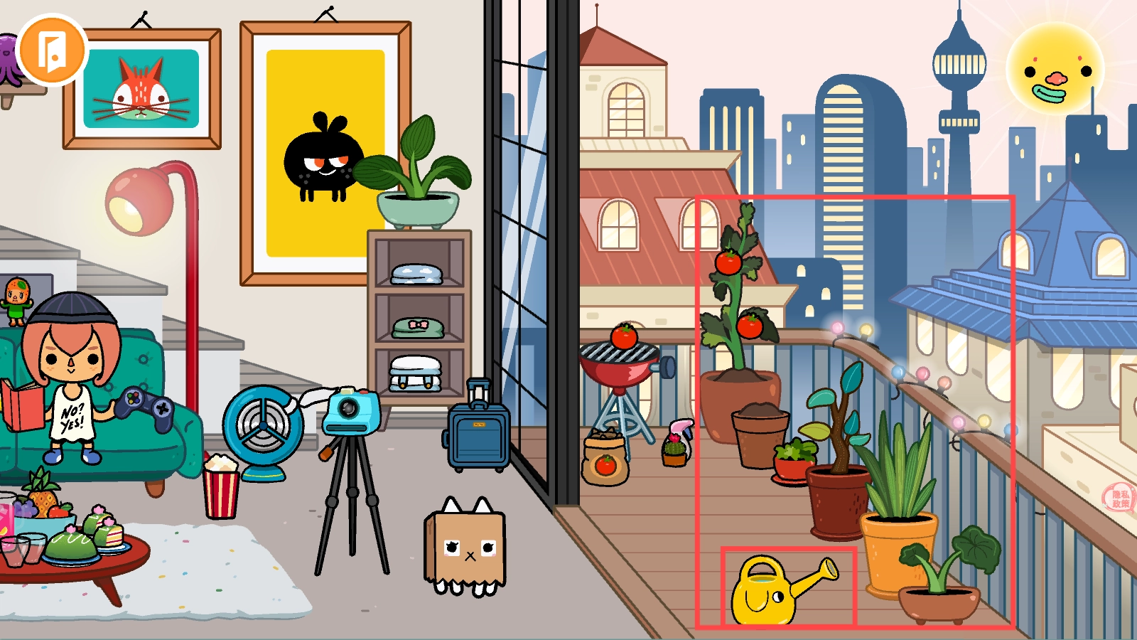 来到阳台这个场景,你可以拿起黄色的水壶给植物浇浇水,悉心照料那些盆栽,还能亲手采摘最新鲜的瓜果蔬菜,尽情感受打理花园带来的悠闲乐趣。