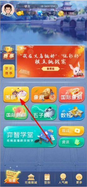 打开弈战平台,登录后进入主页,主页设有赛事资讯、围棋、象棋、五子棋、数独等功能栏,点击其中的围棋选项。