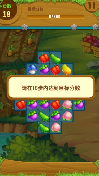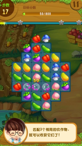 在每一关给定的步数限制或时间限制内,玩家可以交换相邻两个农产品的位置,一旦有三个及以上相同的农产品在横向或纵向连成一条直线,这些农产品就会消除,并且消除的数量会被统计到关卡进度中。