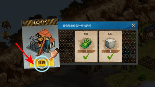 材料收集完毕后,点击红色箭头所指的建设按钮,就能启动谷仓修复工作,推动任务进度。