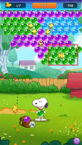 红框标出的区域是带有小黄鸟的绿色泡泡,史努比会发射绿色泡泡,对准这个区域进行消除就能得到小黄鸟。