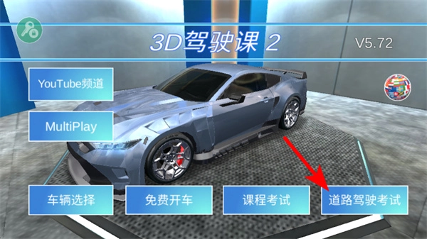 在游戏主界面,找到红色箭头所指的道路驾驶考试按钮并点击,就能进入驾驶考试关卡。