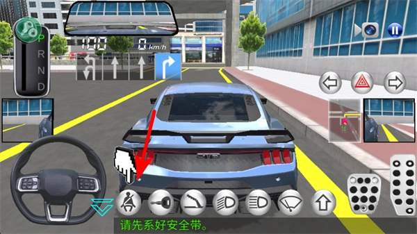 进入驾驶界面后,先点击红色箭头所指的安全带按钮,完成系好安全带的准备工作。