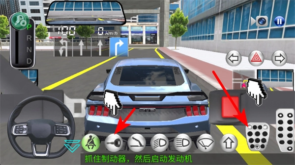 根据提示,先点击红色箭头所指的制动器按钮,接着点击发动机按钮,以此完成车辆启动前的准备工作。