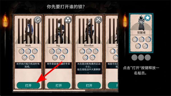 在船员选择界面,点击红色箭头所指的开启按钮,就能让对应的船员加入队伍,从而推动剧情发展。