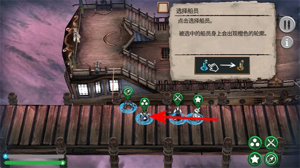 点击红色箭头所指向的船员,即可选中该船员并使其出现橙色轮廓,以此完成选择船员的操作要求。