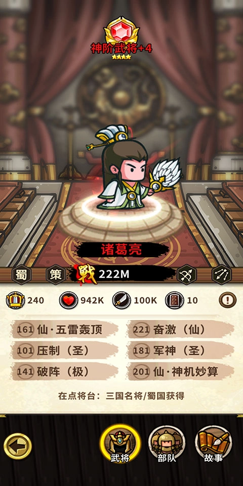 技能:仙·五雷轰顶、奋激(仙)、压制(圣)、军神(圣)、破阵(极)、仙·神机妙算。