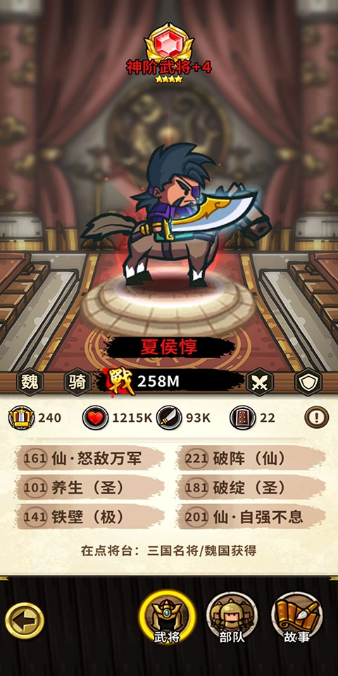 技能:仙·怒敌万军、破阵(仙)、养生(圣)、破绽(圣)、铁壁(极)、仙·自强不息。