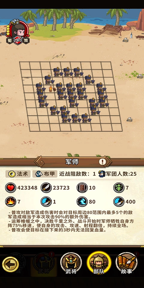 在营帐之中运筹谋划,便能决定千里之外战场上的胜负。战斗开启的瞬间,军师会牺牲自身方阵75%的移动速度,以此让自身的攻击力、攻击速度与攻击射程均提升至原来的两倍,且该效果将持续整场战斗。