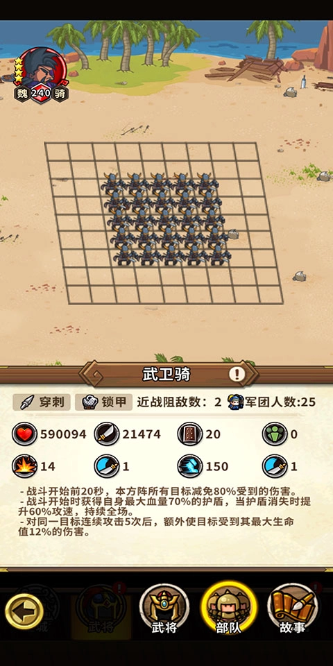 效果:己方方阵内所有士兵攻击敌方士兵时,将分别有10%、15%、20%的几率使目标陷入2秒眩晕状态(该技能1级解锁,3级和5级可提升触发几率属性)