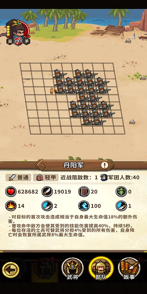 每位存活的士兵能为武将分担4%所承受的全部伤害,当士兵自身阵亡时,会为所属武将恢复其8%的最大生命值。