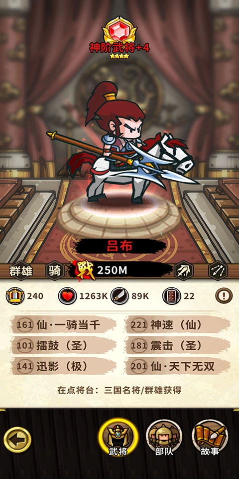 技能:仙·一骑当千、神速(仙)、擂鼓(圣)、震击(圣)、迅影(极)、仙·天下无双。