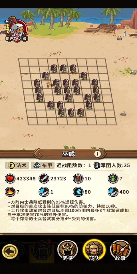 效果:自身方阵的武将与士兵攻击速度提升25%/30%/35%,此外所有处于战场的己方治疗部队,在进行治疗时还能恢复目标被削减的血量上限(该技能1级即可解锁,3级和5级时会提升相关属性效果)