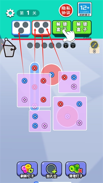 在游戏里,只要点击三个红色螺丝并把它们放进红色盒子,就能完成消除;而蓝色螺丝则需要放入蓝色盒子中。