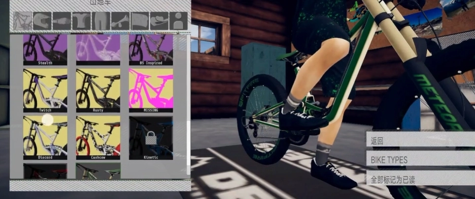 我们会发现它最初的back type是LX20 and trail,这意味着它类似一款领骑车型。接着会看到下方的DJ(突破车型)和DH车型目前都是锁定状态。要解锁它们的话,首先需要进入骑行界面。