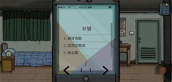 按备忘录里的顺序先去洗漱,洗手间地面有个纸团,把它捡起来,然后在手机上查看信息。