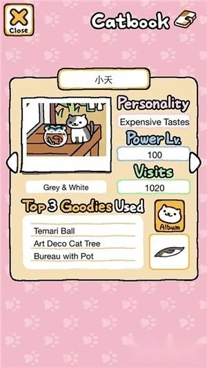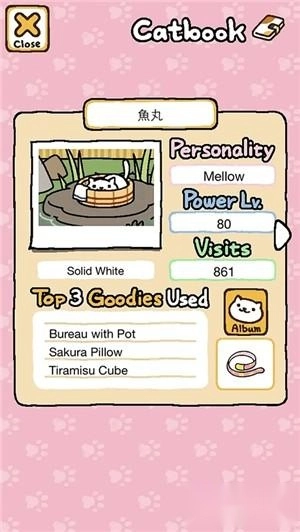 游戏里的道具有不少种类,刚开始玩的时候,你肯定会先挑选自己喜欢的来买。不过实际上,每只猫咪都有它们各自钟爱的玩具,这些偏好会清楚地显示在每只猫的名片信息里。尤其是那些特殊猫咪,必须使用特定的玩具才能够将它们召唤出来。而看着自己喜欢的猫咪们在各种各样的道具上嬉戏玩耍,展现出不同的可爱姿态,这正是这款游戏最让人觉得有趣的地方。